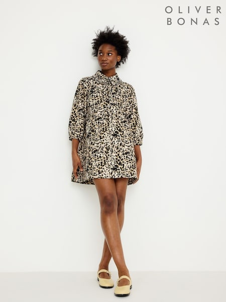 Oliver Bonas Natural Animal Print Frill Collar Denim Mini Dress