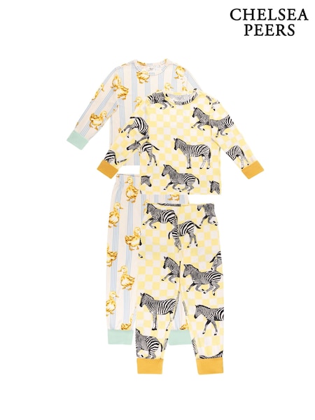 Chelsea Peers Yellow Kids Limoncello Zebra/Fluffy Ducklings Stripe Print Long Pyjamas Set 2 Pack