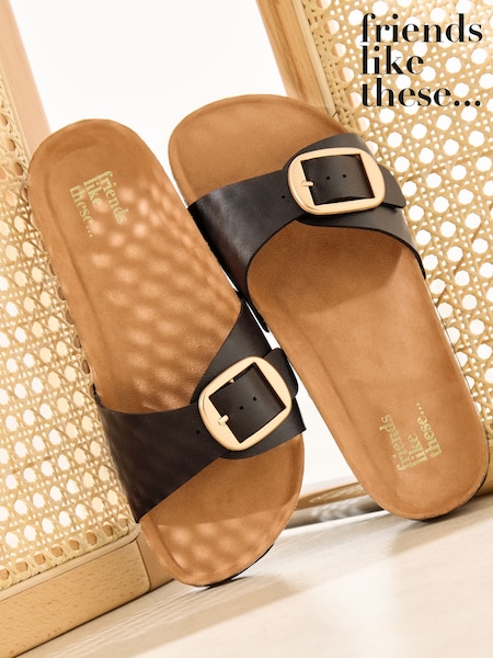 Friends Like These Black Faux Leather Single Strap Buckle Detail Casual Footbed Sandals