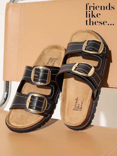 Friends Like These Black Faux Leather Standard Fit Double Buckle Strap Flat Comfort Footbed Sandals