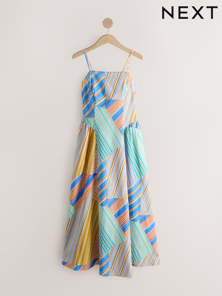 Blue and Yellow Stripe Cotton Rich Thin Strap Summer Dress