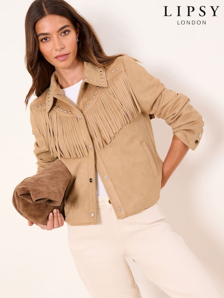 Lipsy Sand Fringed Faux Suede Studded Jacket