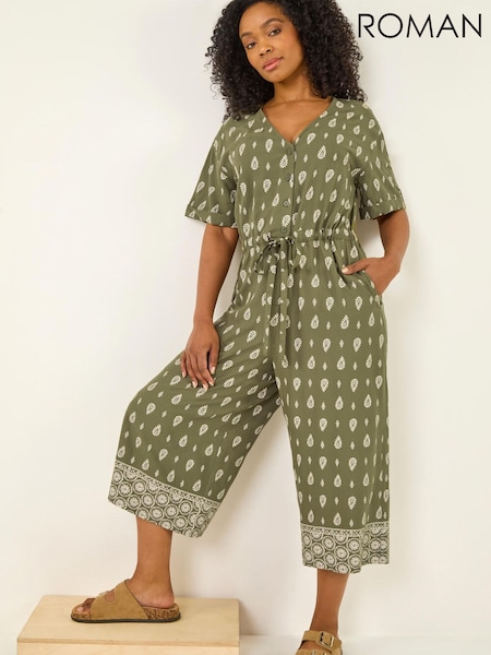 Roman Green Petite Border Print Cropped Jumpsuit