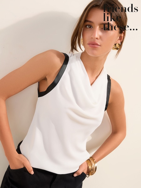 Friends Like These White Smart Cowl Neck Tipped Sleeveless Blouse